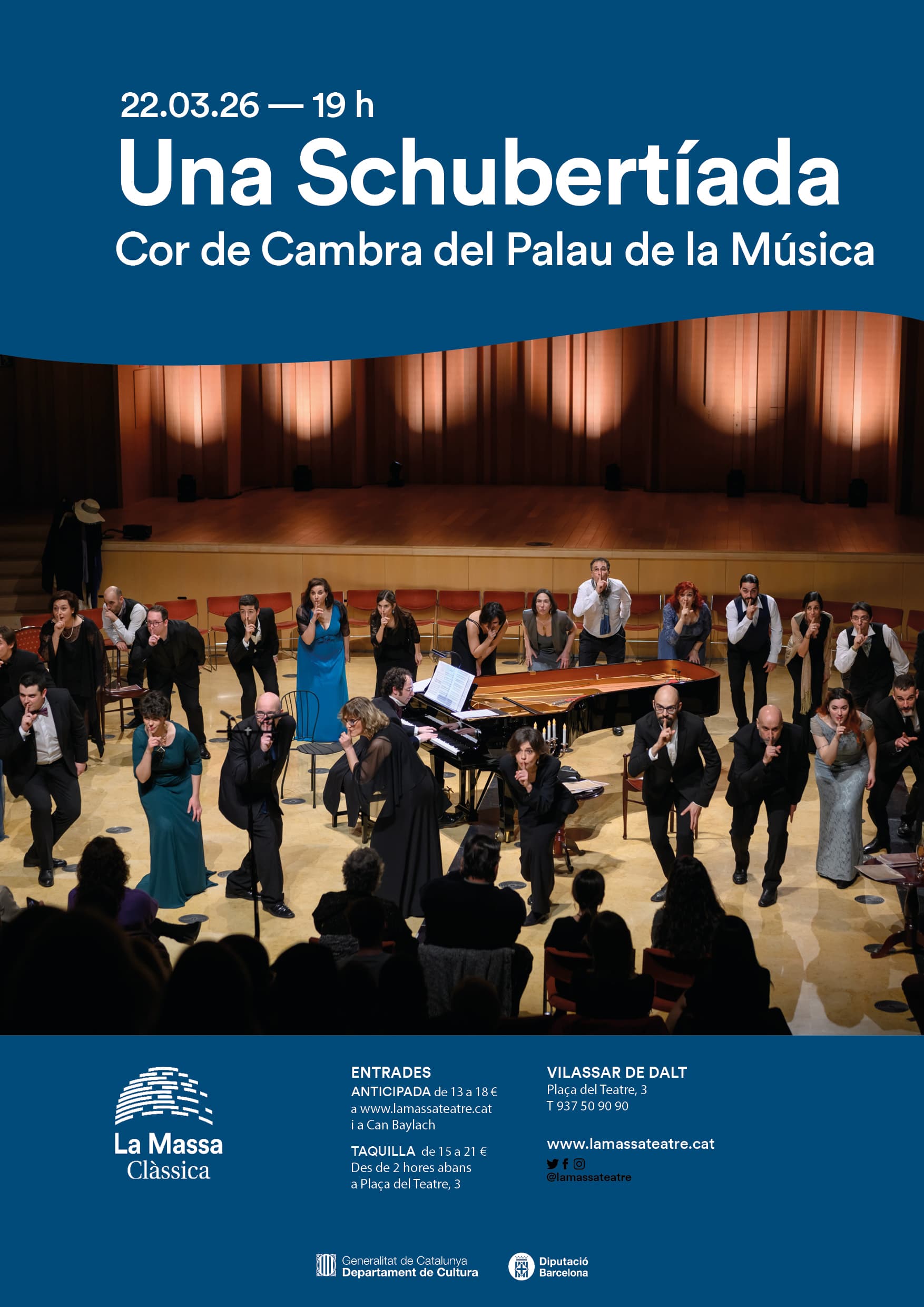 El Cor de Cambra del Palau recrea aquelles vetllades anomenades Schubertíades, en què un grup d’artistes i amics de Franz Schubert es reunien a casa de la família Sonnleithner per cantar, recitar poesia, crear obres pictòriques... en un entorn artístic irrepetible. Aquesta és, doncs, una vetllada amb la música coral de Schubert i també de Haydn, Beethoven o Rossini. Una invitació a la Viena de principis del segle XIX, amb la col·laboració de l’actor Bernat Cot, el pianista Jordi Armengol i amb la direcció escènica d’Anna Romaní.